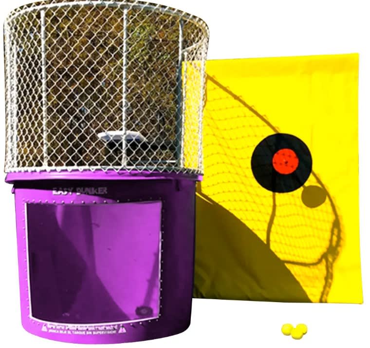 - Does it come with balls? Yes, the Dunk Tank comes with 3 balls to throw at the target.